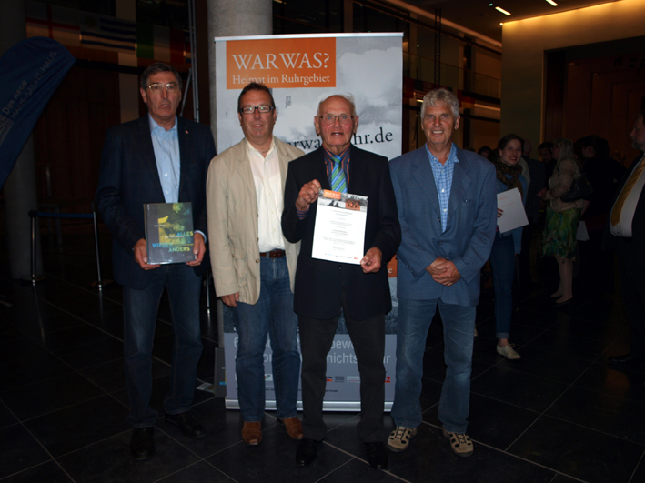 Die Buchautoren präsentieren die erhaltene Auszeichnung im Anschluss an die Preisverleihung im Gelsenkirchener Hans-Sachs-Haus: v. l. Arthur Ensenbach, Peter Voß, Heinz Assmann, Oskar Baumgärtel.